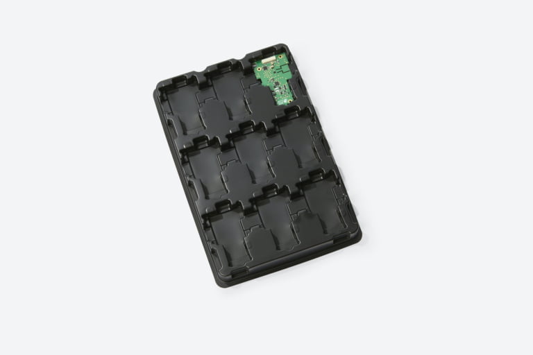 Vakuumformad display för Maria Åkerbergs hudvårdsprodukter med golvstativ av metall.